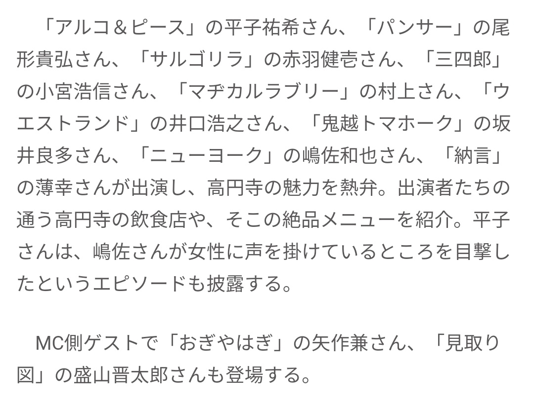 ã¢ã¡ãã¼ã¼ã¯ é«å寺è¸äºº ã'ã³ãµã¼å°¾å½¢ãèªãä¸åæ²¢ã¨ã®éãã¨ã¯ ã©ã ã"ã¼ã¹ ãã¥ã¼ã¹ãã¬ã¸ã³ from laughmaga.yoshimoto.co.jp Jun 16, 2021 · 明日6月17日(木)放送の「アメトーーク!」(テレビ朝日系)に、東京・高円寺をこよなく愛する「高円寺芸人」が集結. Jun 17, 2021 · 6月17日(木)放送の『アメトーーク!』は、東京のディープタウン・高円寺に住んでいる&よく遊びに行く芸人たちが集結する「高円寺芸人」をお届け。37年高円寺在住という小宮浩信(三四郎)をリーダーに、平子祐希(アルコ&ピース)、尾形貴弘(パンサー) Jun 16, 2021 · 6月17日(木)23:15から放送(一部地域を除く)の『アメトーーク!』に、高円寺芸人が集結するというニュースが届きました! 高円寺をこよなく愛する芸人集結! 東京のディープタウン・高円寺に住んでいる&よく遊びに行く芸人 … Jun 18, 2021 · トップ > ・アメトーーク! > アメトーーク 6月17日「高円寺大好き芸人」マヂラブ村上は本当に出没する店! 芸人が多く住むディープな街が面白い! Jun 17, 2021 · テレビ朝日「アメトーーク! ~高円寺芸人~」で2021年6月17日(木)に放送された内容です。当日に放送された情報もタイムリーに更新しています。 Jun 18, 2021 · 「hotワード#アメトーーク x 冠番組芸人」ツイート一覧。7月1日の地方冠番組芸人も楽しみやなぁ アメトーーク 動画 立ちトーク 2021年6月24日 2021/06/25 アメトーーク 動画 高円寺芸人が集結 6月17日 2021/06/18 アメトーーク 動画 大学お笑いサークル芸人が集結 6月10日 2021/06/11 Jun 22, 2021 · 人気無料漫画サイト「ピッコマ」等で連載を行なっている女性漫画家の鈴木倫さんが17日、自身のtwitterを更新。 同日に放送されていた「アメトーーク」の高円寺芸人に出演をしている芸人から、ホテルに誘われるなどセクハラをされたと漫画で報告をしたため、波紋が広がっています。